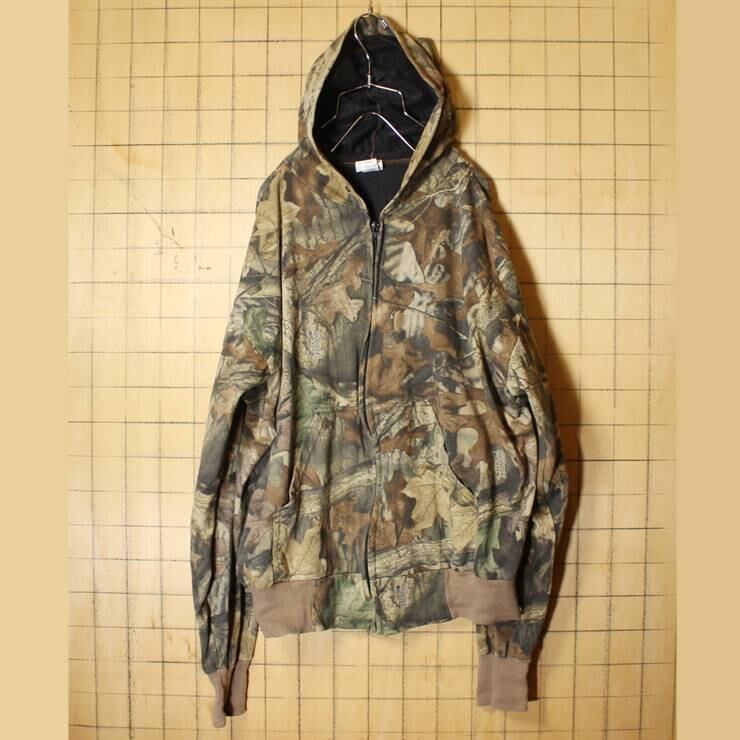 80s USA製 迷彩 スウェットパーカー ライナー付 グリーン メンズXL フーディー リアルカモフラージュ ハンティング アメリカ古着 010621aw5