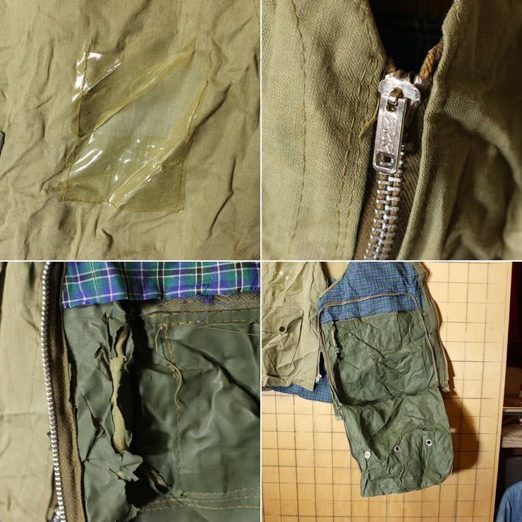 右胸のビニールポケットが破損しています。ポケット内のコーティングが劣化し、ひび割れをしています。