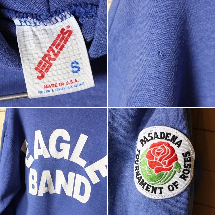 USA製 JERZEES 両面プリント スウェットパーカー ブルー メンズS フーディー EAGLE BAND ワッペン アメリカ古着です。