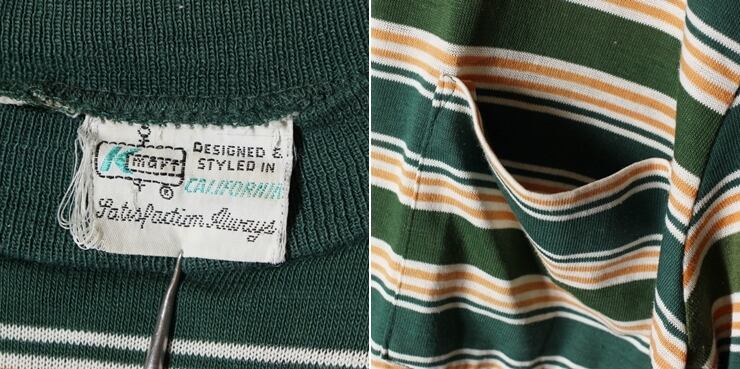 70s 80s CALIFORNIA Kmart ボーダー 半袖 ポケット Tシャツ カーキ グリーン メンズS相当 レディースM相当 アメリカ古着 081820aw106