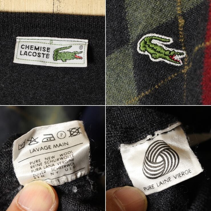 フレンチ ラコステ LACOSTE アーガイルチェック ウール ニット セーター Vネック グレー メンズL相当 ヨーロッパ古着です。