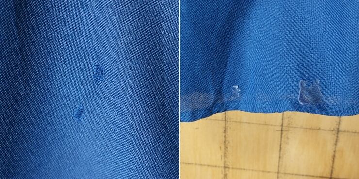 肩付近にほつれ、色あせがあります。左胸ポケットのスナップボタンは変形し留めることができません。