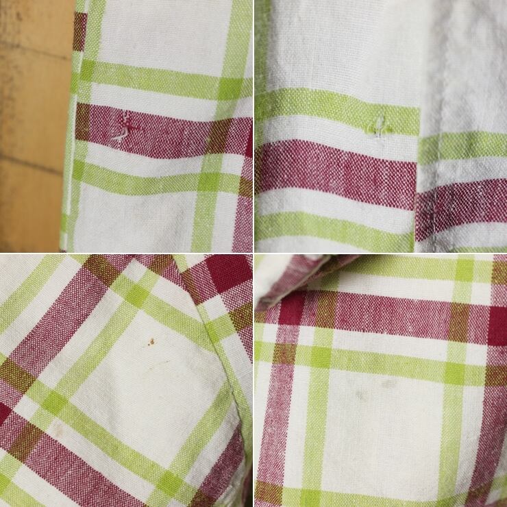 裾付近にほつれ、上から3つ目のボタン付近、右袖、左袖背面、左脇腹背面付近にシミがあります。