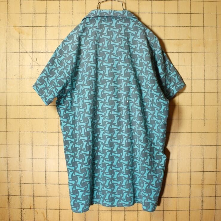 60s 70s EURO HEMDEN ボックス シャークカラー 総柄 シャツ エメラルドグリーン メンズM相当 半袖 オープンカラー 開襟 幾何学模様 古着 040721ss58