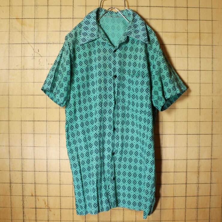 60s 70s EURO ボックス シャークカラー 総柄 シャツ ライトグリーン メンズSM相当 半袖 オープンカラー 開襟 幾何学模様 ヨーロッパ古着 040721ss59