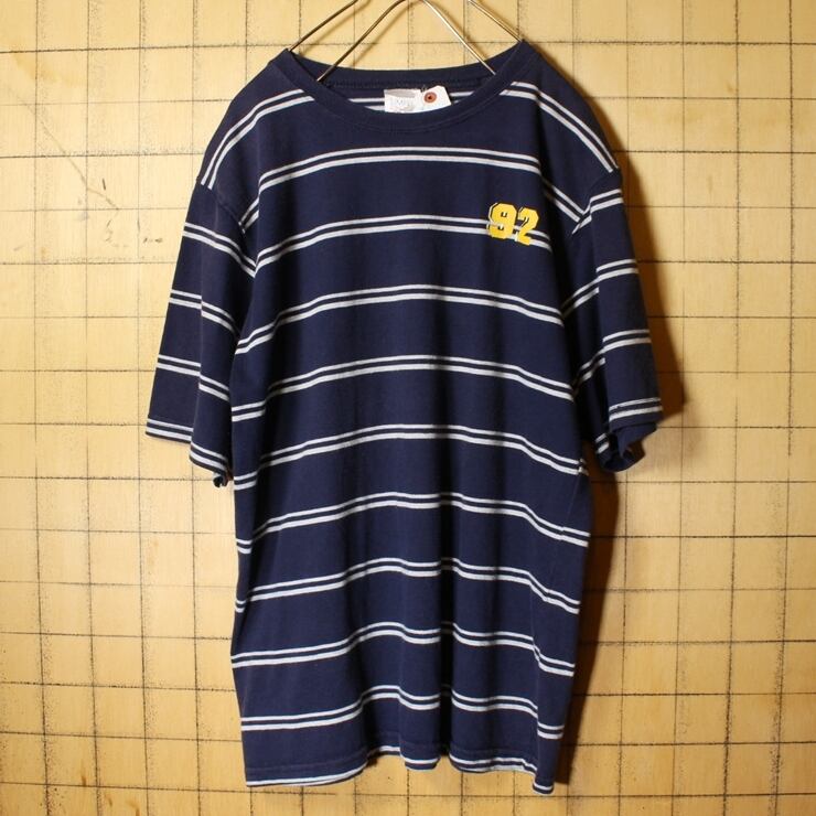 80s 90s ボーダー プリント Tシャツ ネイビー ブルー 青 メンズM相当 アメリカ古着 ts-211