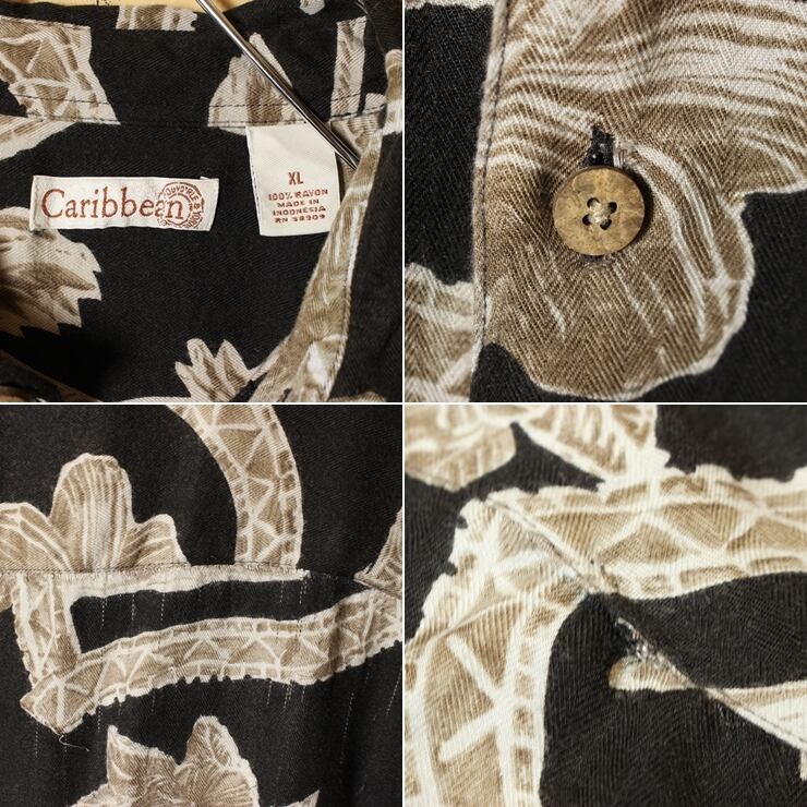 ビッグサイズ Caribbean 草花柄 ハワイアン レーヨン シャツ メンズXL ブラック 黒 アロハ 半袖 アメリカ古着です。