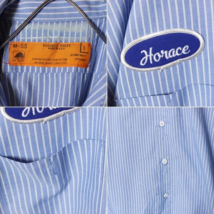 70s 80s USA製 RED KAP レッドキャップ 半袖 ストライプ ワーク シャツ ライトブルー メンズM ワッペン アメリカ古着です。
