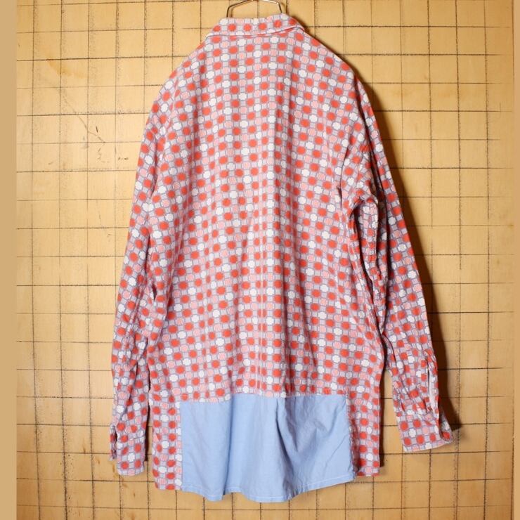 60s 70s EURO 総柄 ボックス 長袖 シャツ オレンジ メンズL相当 幾何学模様 ヨーロッパ古着 062321ss74