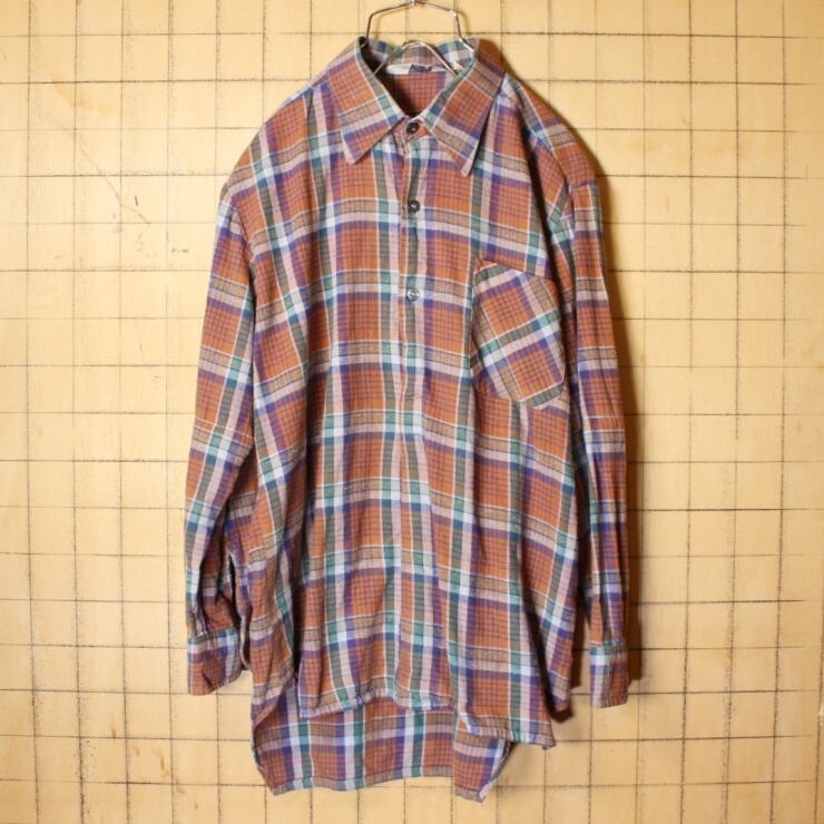 60s 70s EURO チェック プルオーバー グランパ シャツ ブラウン グリーン メンズM相当 長袖 グランドファーザー ヨーロッパ古着 062321ss85