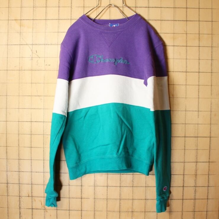 90s USA製 Champion チャンピオン ロゴ 刺繍 スウェット パープル ホワイト グリーン レディースS相当 トレーナー アメリカ古着 pan-529