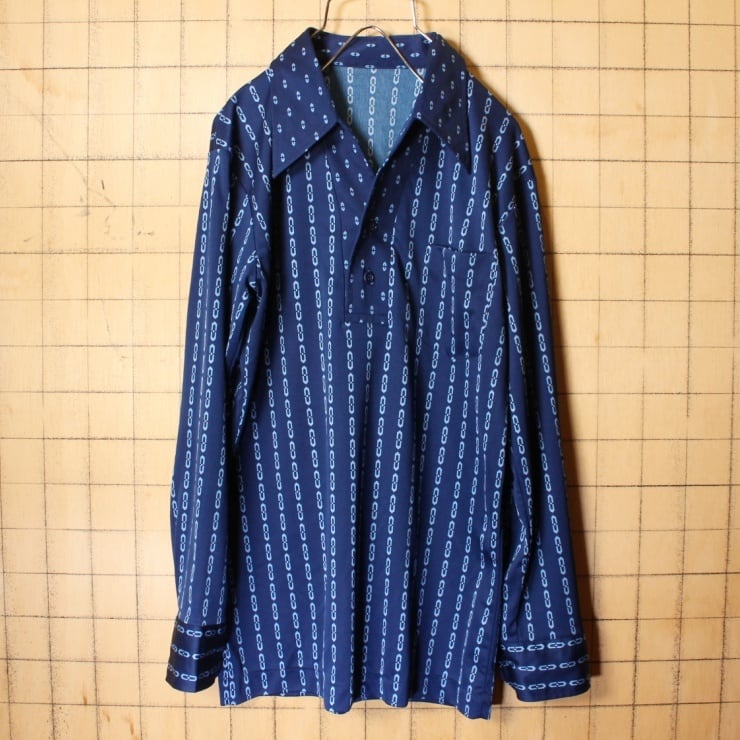 70s USA プルオーバー ポリエステル シャツ メンズS相当 ネイビー ブルー 長袖 アメリカ古着 nta-138