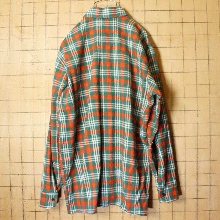 70s 80s EURO permaflott チェック フランネル コットン シャツ グリーン オレンジ メンズL 長袖 ヨーロッパ古着 101321aw49