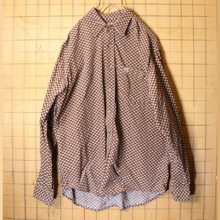 70s 80s EURO PIONEER 総柄 コーデュロイ シャツ ブラウン イエロー メンズL 長袖 ヨーロッパ古着 101321aw59