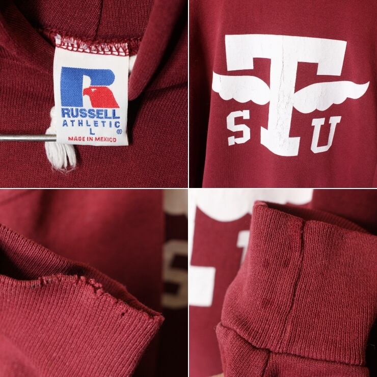80s 90s RUSSELL ATHLETIC プリント スウェット パーカー ボルドー レッド メンズL ラッセルアスレティック フーディ アメリカ古着 yan-14