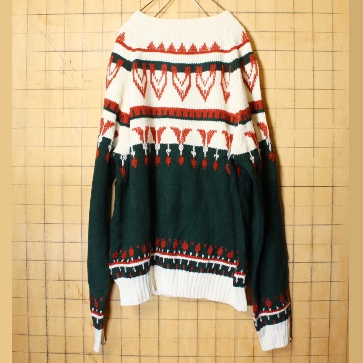 70s 80s JCPenney アクリル ニット セーター ホワイト グリーン メンズL ノルディック ハイネック アメリカ古着 121521aw54