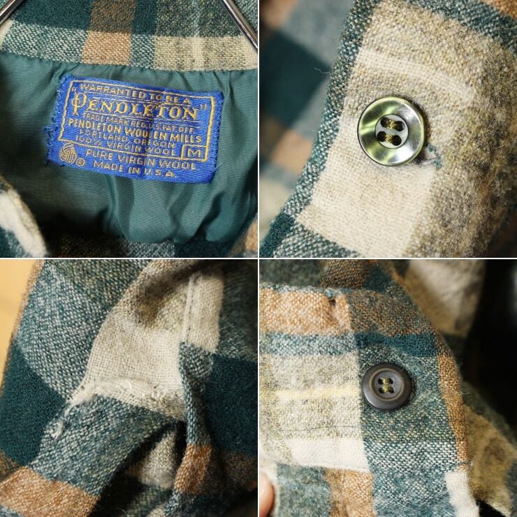 70s USA製 PENDLETON ペンドルトン ウール チェック オープンカラー シャツ 長袖 グリーン ブラウン メンズM ボックス 開襟 アメリカ古着です。