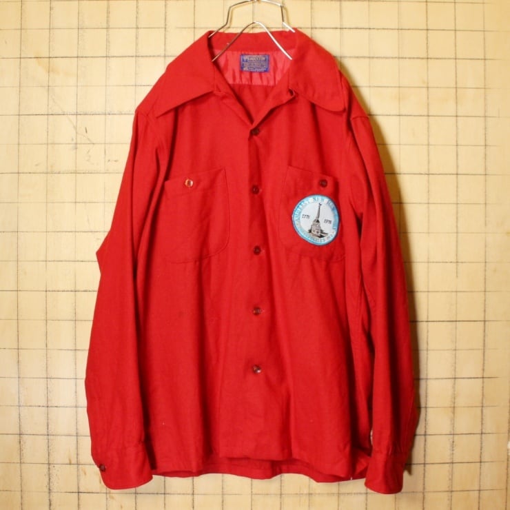 70s USA製 PENDLETON ペンドルトン ウール チェック オープンカラー シャツ 長袖 レッド メンズM ボックス 開襟 アメリカ古着 121521aw43