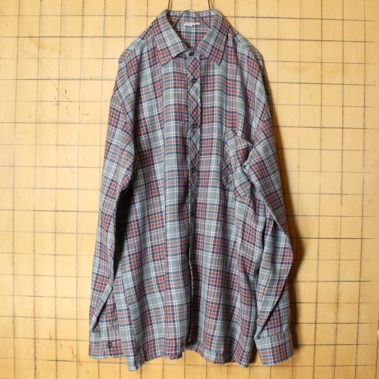 60s 70s EURO チェック ネル シャツ メンズL相当 グレー レッド 長袖 ヨーロッパ古着 020222ss96