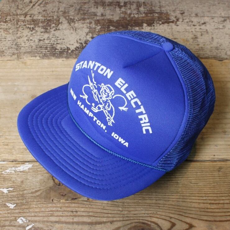 USA プリント メッシュ キャップ 帽子 ELECTRIC STANTON NEW HAMPTON, IOWA ブルー 青 フリーサイズ アメリカ古着です。