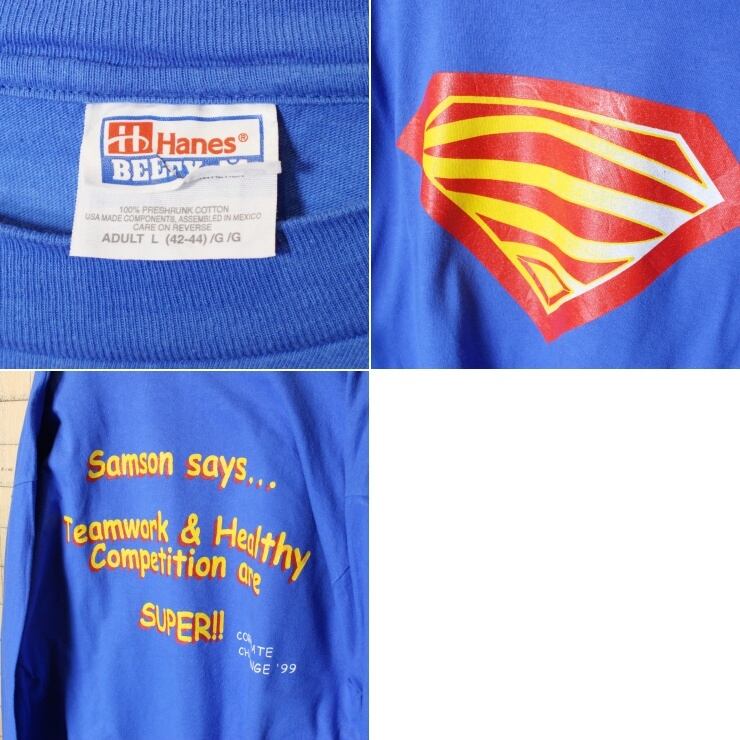 カラーはブルー、フロントにはスーパーマンのようなロゴ、バックにもプリントが入っています。