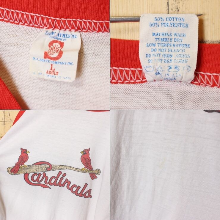 70s 80s USA製 SOFFE ATHLETIC Cardinals カージナルス プリント ラグラン Tシャツ レッド 七分袖 メンズL アメリカ古着 051122ss57