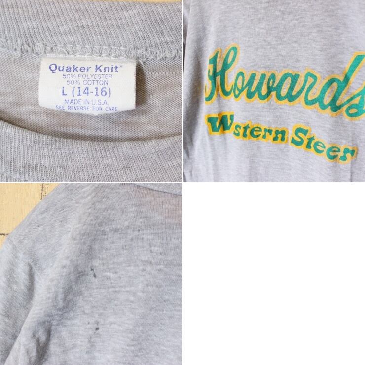 70s 80s USA製 Quaker Knit Howard's Western Steer プリント Tシャツ 半袖 グレー レディースXS キッズL アメリカ古着 071322ss152