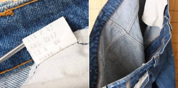 裾のステッチは外された状態、右足の裾の生地が一部切り取られています。
