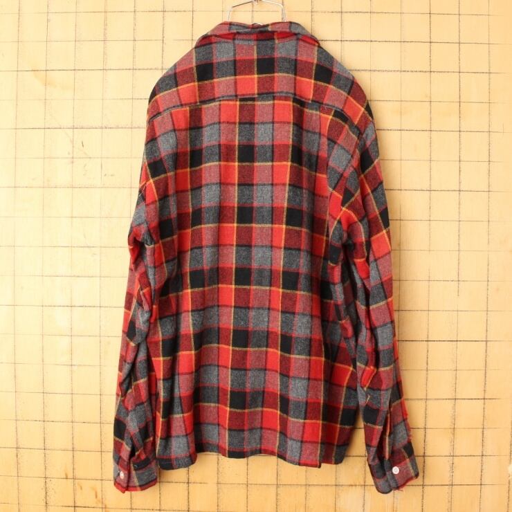 60s 70s USA ウール チェック オープンカラー シャツ 長袖 レッド メンズM アメリカ古着 091022aw96