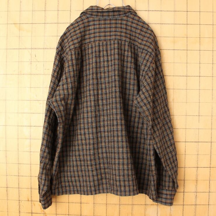 60s 70s USA ウール チェック オープンカラー シャツ 長袖 ブラウン メンズL相当 アメリカ古着です。
