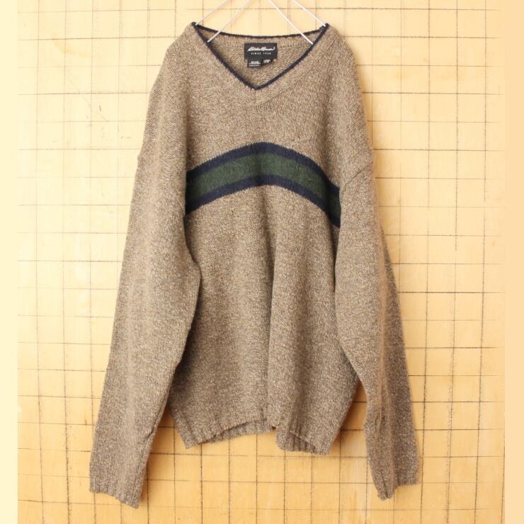 90s USA製 Eddie Bauer エディーバウアー ウール ニット Vネック ボーダー セーター ベージュ メンズL アメリカ古着 110222aw65