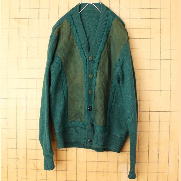 70s 80s USA ウール ニット スウェード レザー カーディガン グリーン メンズML相当 アメリカ古着 110222aw101