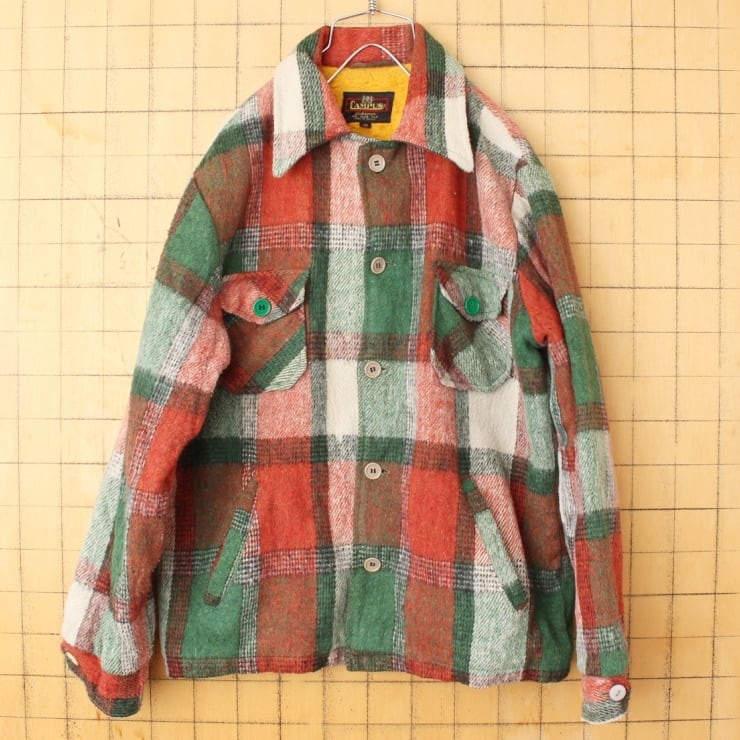 70s 80s USA CAMPUS ウール チェック シャツ ジャケット メンズM相当 ライナー付 長袖 レッド グリーン アウトドア アメリカ古着です。