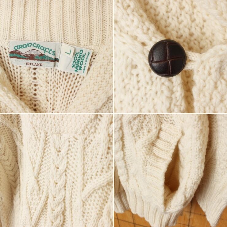 アイルランド製 aran crafts ウール ショールカラー ケーブル編み フィッシャーマン セーター ベージュ メンズL プルオーバー ヨーロッパ古着です。