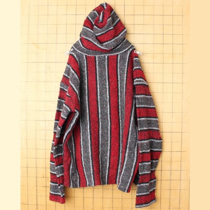 80s 90s メキシカンパーカー プルオーバー ジャケット レッド グレー メンズL相当 ストライプ 古着 010523aw72