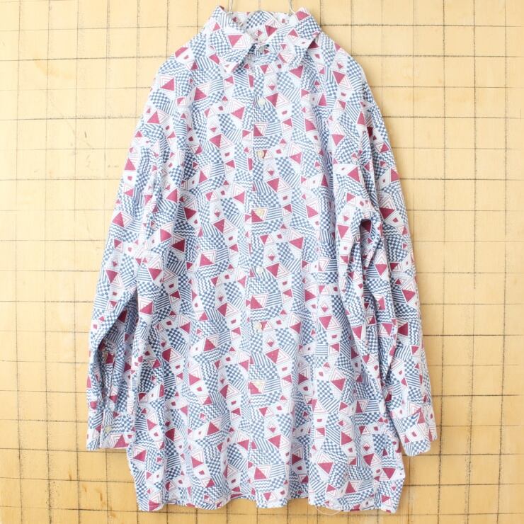 60s 70s EURO フランス ドイツ 総柄 シャツ メンズL相当 レッド ネイビー 長袖 幾何学模様 ヨーロッパ古着 041223ss132
