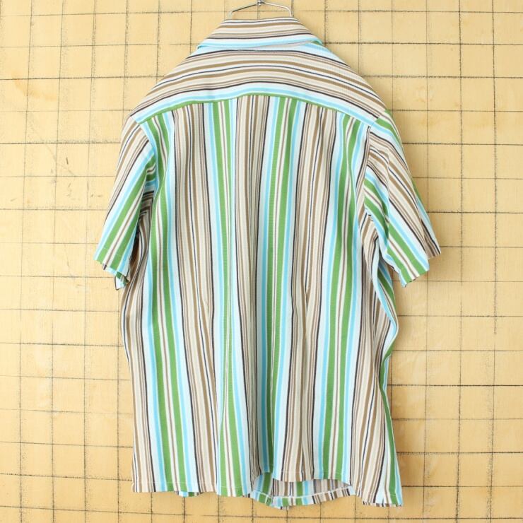 70s 80s USA Bud Berma 半袖 ポリエステル ストライプ ボックス シャツ グリーン ブラウン メンズL アメリカ古着 041223ss107