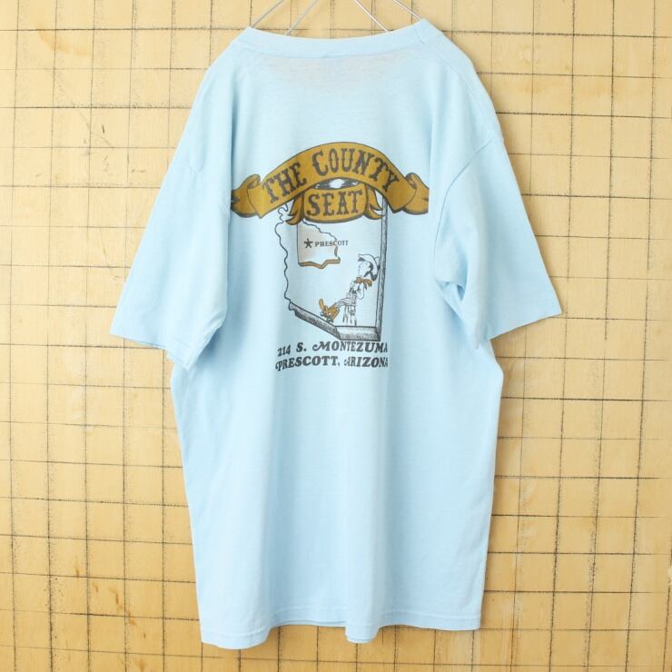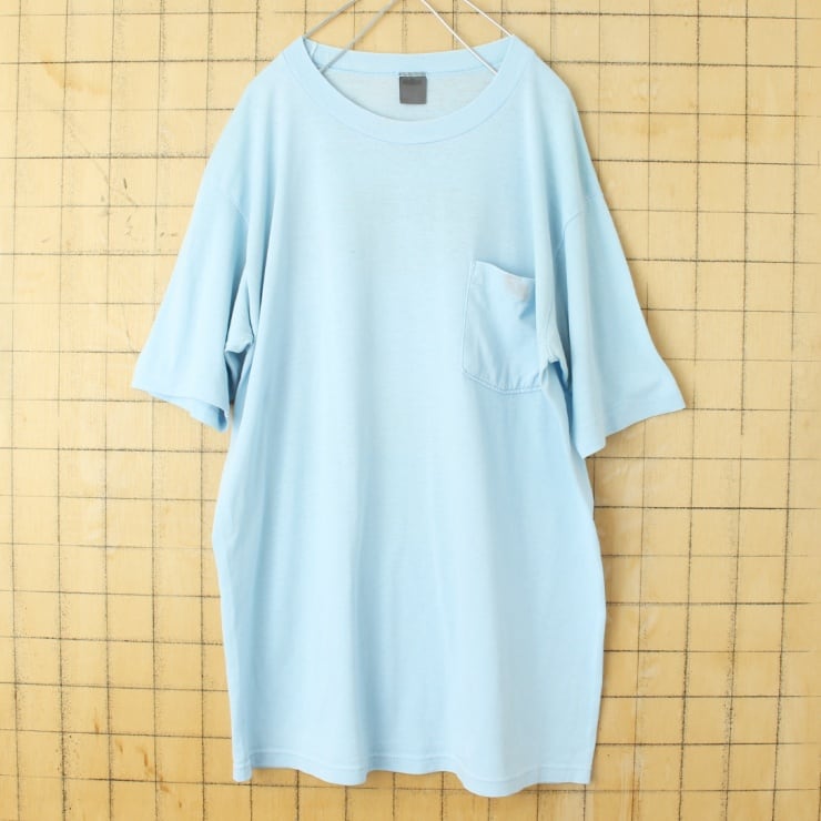 80s 90s USA バックプリント 半袖 ポケット Tシャツ ライトブルー メンズM相当 アメリカ古着 041223ss20