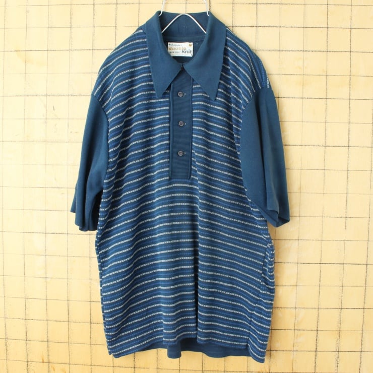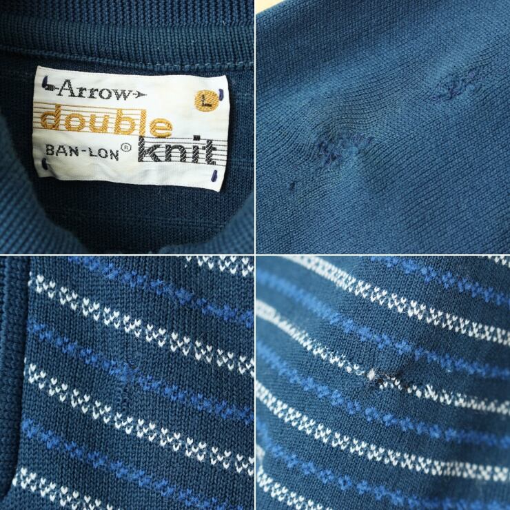 60s 70s USA Arrow バンロン ポロシャツ ネイビー メンズL 半袖 プルオーバー ポリエステル アメリカ古着 060723ss34