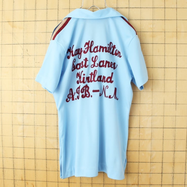 70s 80s USA製 King Louie キングルイ オープンカラー ボウリング シャツ ライトブルー レディースM相当 メンズS相当 半袖 ポリエステル アメリカ古着 060723ss35