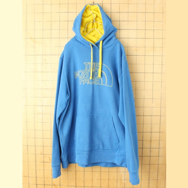 USA THE NORTH FACE ノースフェイス スウェット パーカー ブルー イエロー メンズL フーディー トレーナー アウトドア アメリカ古着 080923aw28
