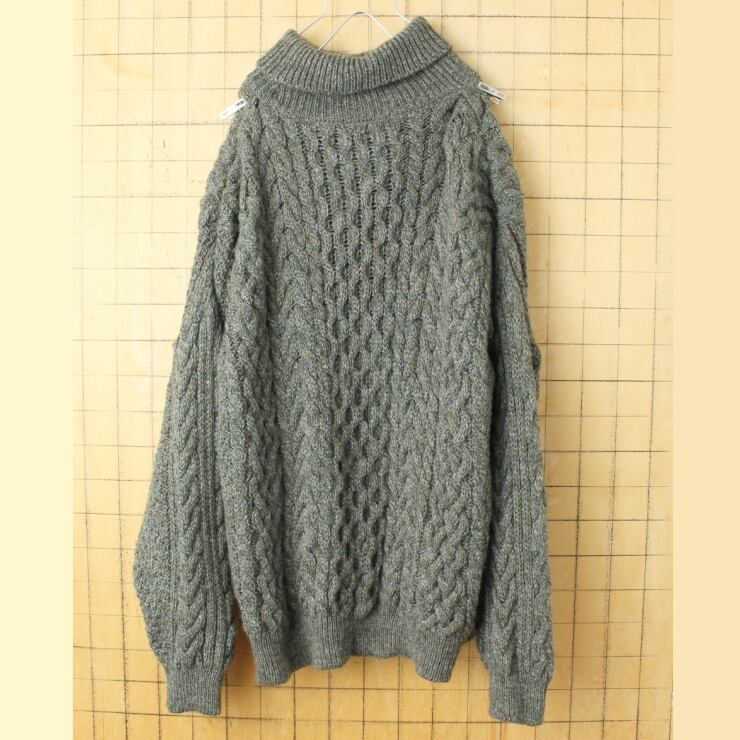 イギリス製 HENRY FOX CASUALS フィッシャーマン ケーブル編み ウールセーター アランニット ハイネック グレー メンズL ヨーロッパ古着です。