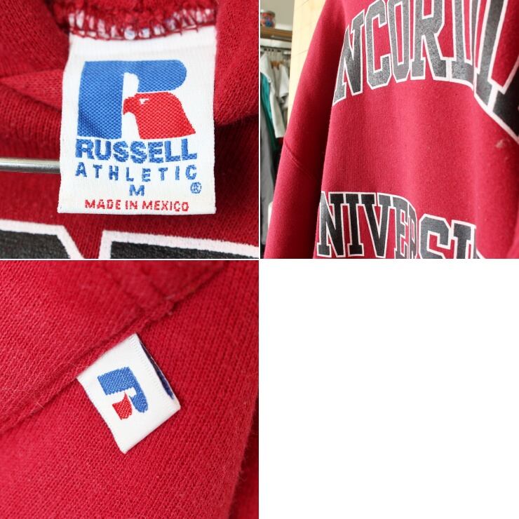 90s USA RUSSELL ATHLETIC CONCORDIA UNIVERSITY プリント スウェット パーカー ボルドー レッド メンズM フーディー アメリカ古着です。