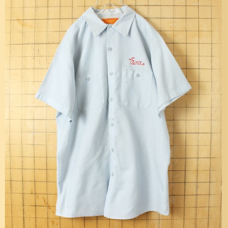 70s 80s USA製 RED KAP レッドキャップ Eric チェーンステッチ ワーク シャツ ライトブルー メンズL 半袖 アメリカ古着です。