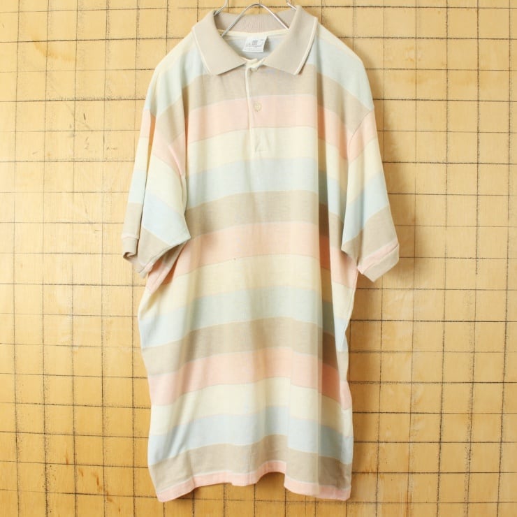 70s 80s USA製 Donegal 半袖 ボーダー ポロシャツ ベージュ ピンク メンズXL アメリカ古着 050824ss105