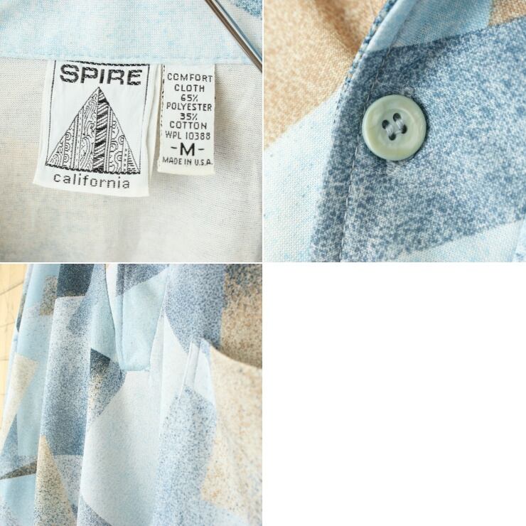 70s 80s USA製 SPIRE california オープンカラー 総柄 ポロシャツ メンズM ブルー 半袖 ポリエステル アメリカ古着 050824ss151