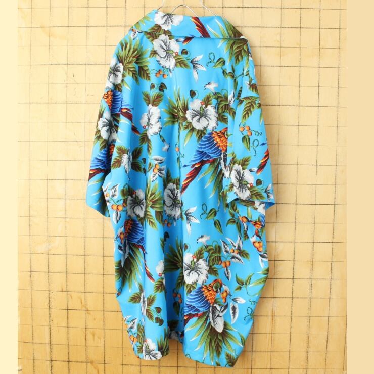 ビッグサイズ USA ナイロン アロハ シャツ メンズ2XL 半袖 ブルー ハワイアン オウム 花柄 アメリカ古着 050824ss49