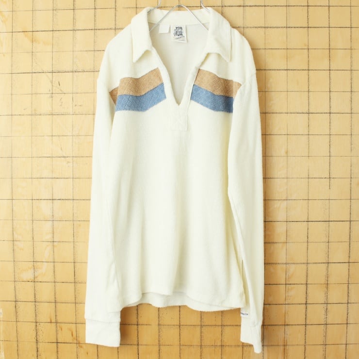 70s 80s USA KENNINGTON ケニントン パイル地 オープンカラー ポロシャツ オフホワイト メンズSM相当 長袖 ビーチ オールドサーフ アメリカ古着 050824ss222
