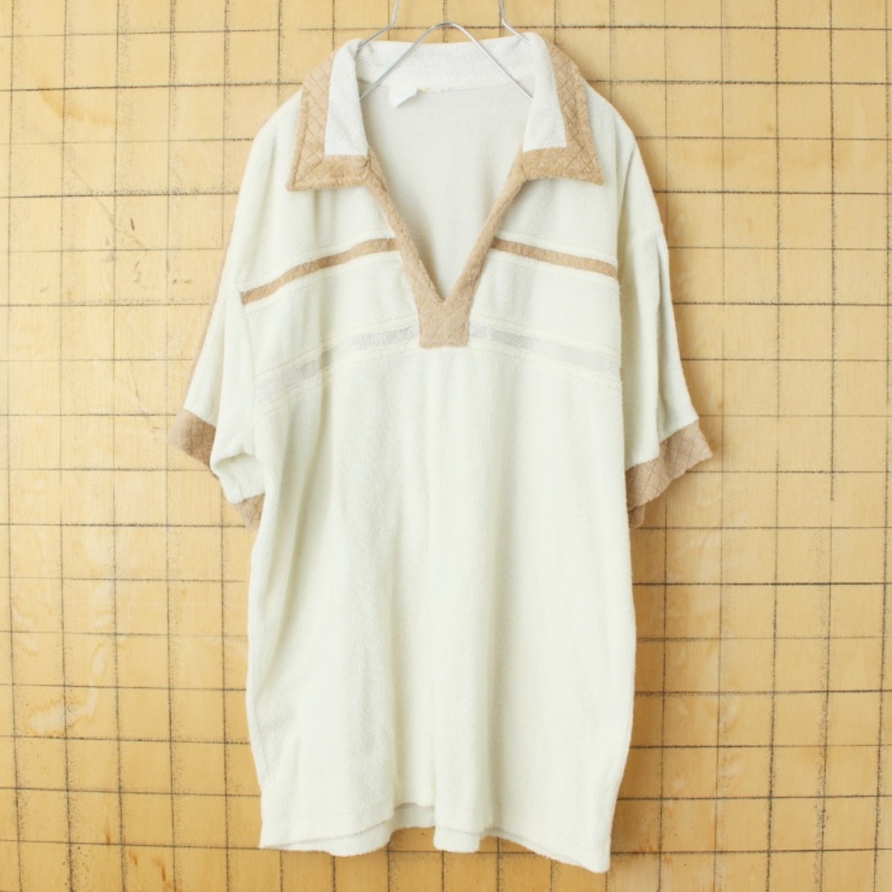 70s 80s USA パイル地 オープンカラー ポロシャツ ベージュ メンズM相当 半袖 ビーチ オールドサーフ アメリカ古着 050824ss182